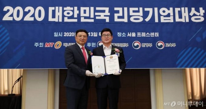 김기영 무궁화전자 대표(사진 오른쪽)가 13일 오후 서울 프레스센터에서 열린 머니투데이 주최의 '2020 대한민국 리딩기업대상'에서 '스마트 화장대' 부문 '홈퍼니싱혁신상'을 받고 이종섭 동국대학교 교수와 기념 촬영 중이다.