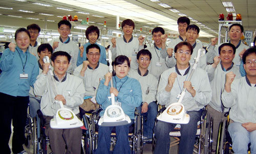 무궁화전자는 삼성전자가 장애인들의 자활을 돕기 위해 1백억원을 출자해 1994년 설립한 장애인 기업. 전체 직원 169명 중 121명이 장애인이다. |